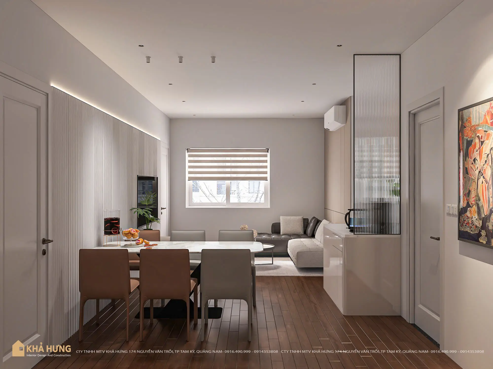 Một căn hộ hiện đại không chỉ là nơi ở, mà còn là không gian sống mang lại sự thoải mái và cân bằng. Với phong cách thiết kế nội thất căn hộ hiện đại kết hợp tinh thần tối giản, căn hộ được bố trí thông minh, nơi phòng khách – bếp – bàn ăn liên kết liền mạch. Sự kết nối này không chỉ tạo nên sự tiện nghi mà còn mang đến cảm giác ấm cúng và gần gũi.