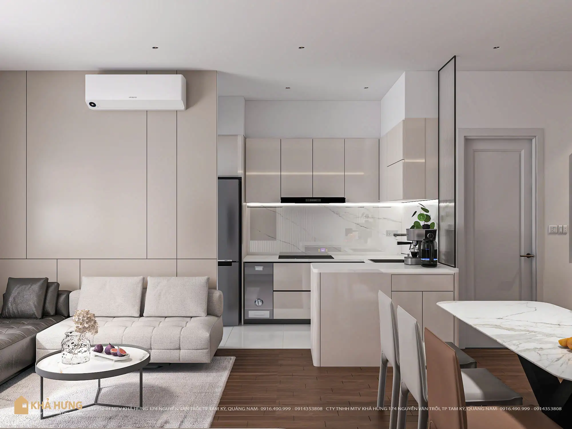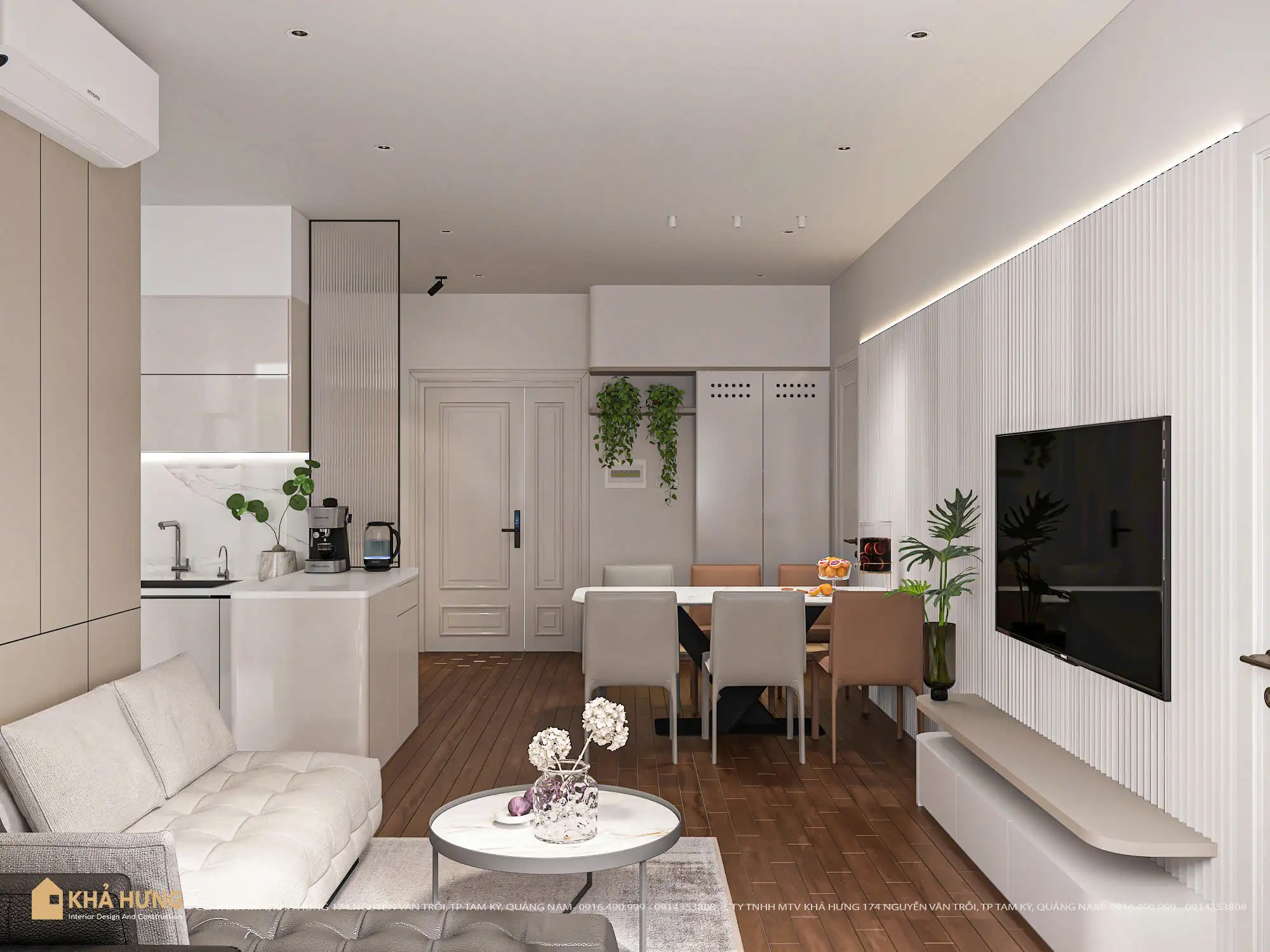 Một căn hộ hiện đại không chỉ là nơi ở, mà còn là không gian sống mang lại sự thoải mái và cân bằng. Với phong cách thiết kế nội thất căn hộ hiện đại kết hợp tinh thần tối giản, căn hộ được bố trí thông minh, nơi phòng khách – bếp – bàn ăn liên kết liền mạch. Sự kết nối này không chỉ tạo nên sự tiện nghi mà còn mang đến cảm giác ấm cúng và gần gũi.