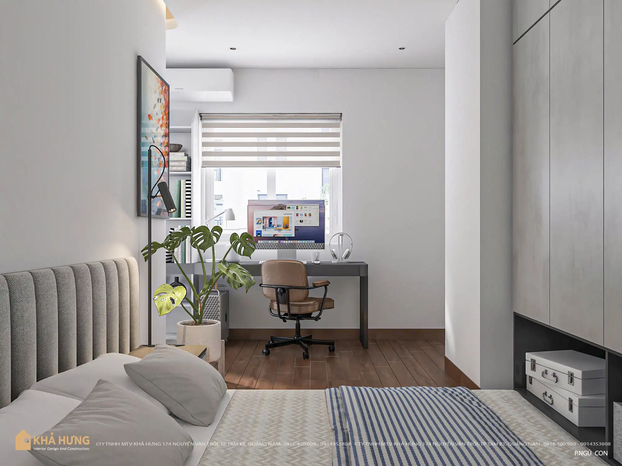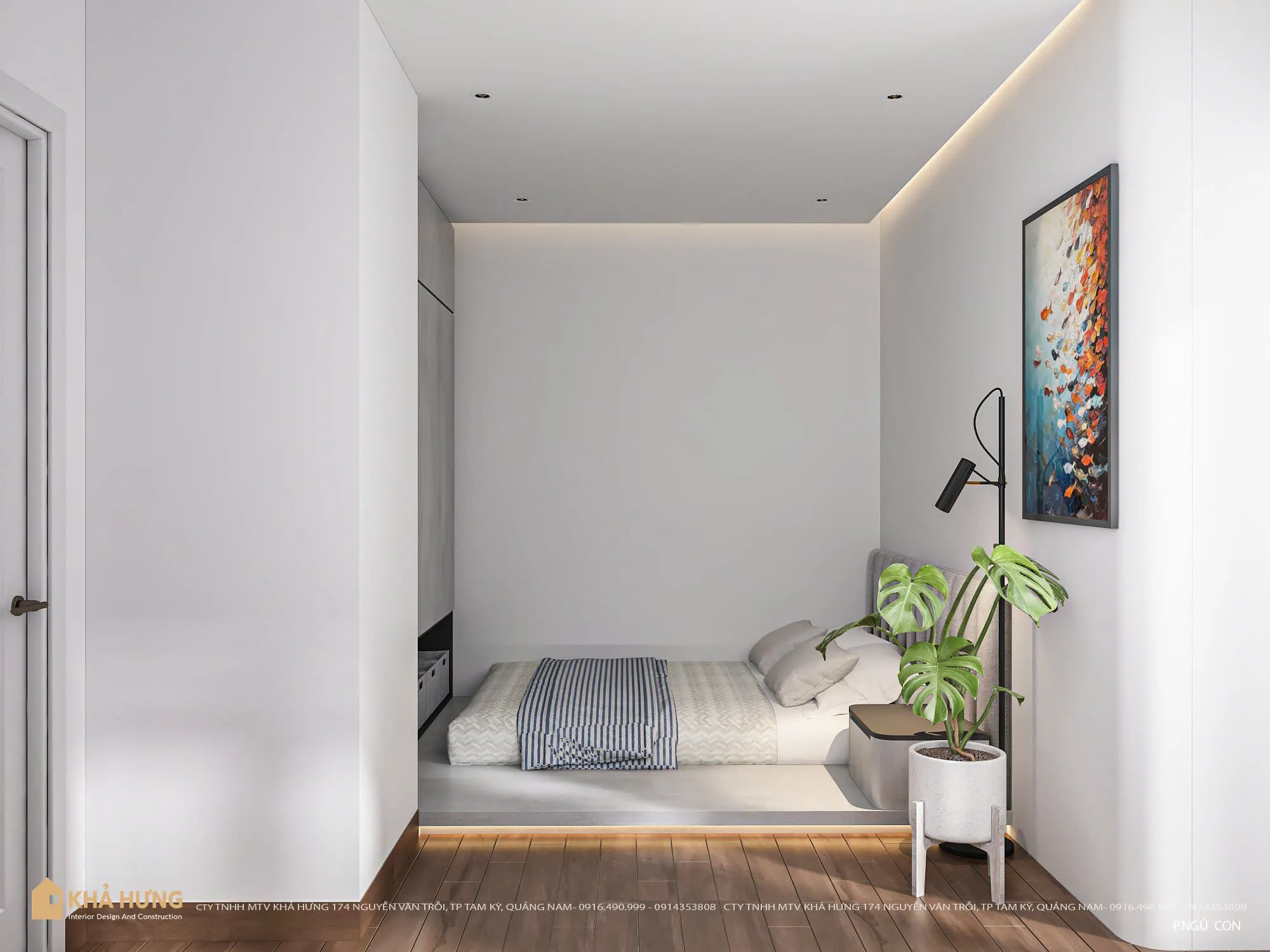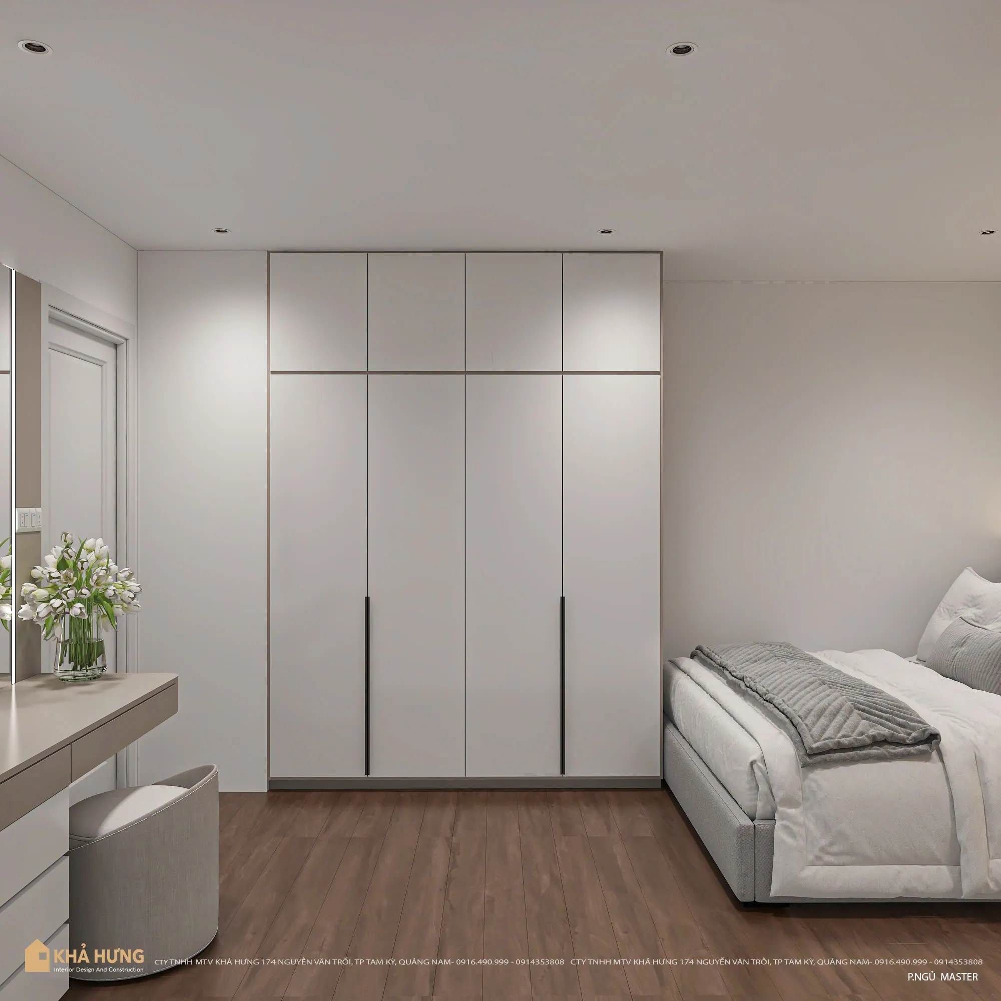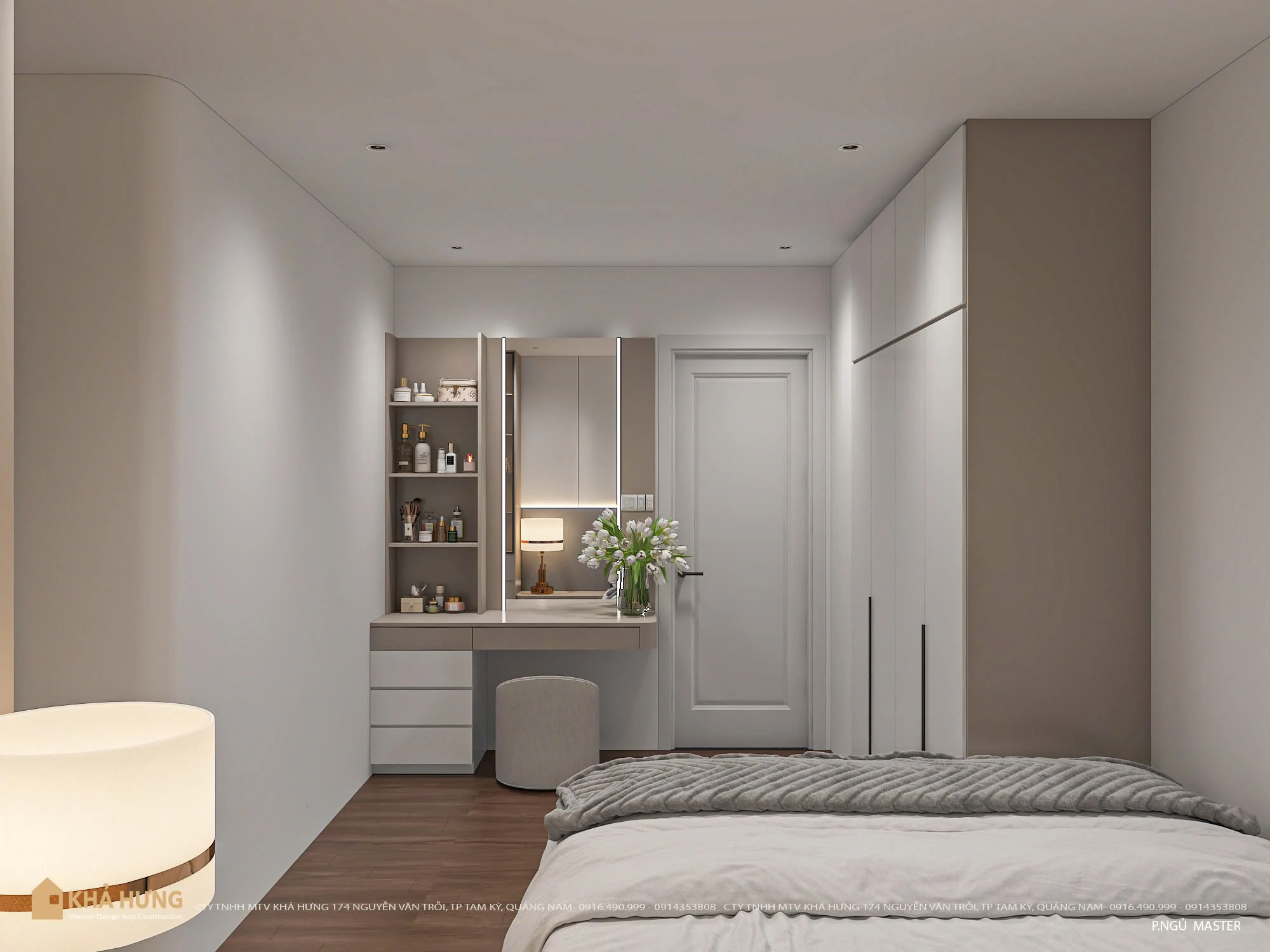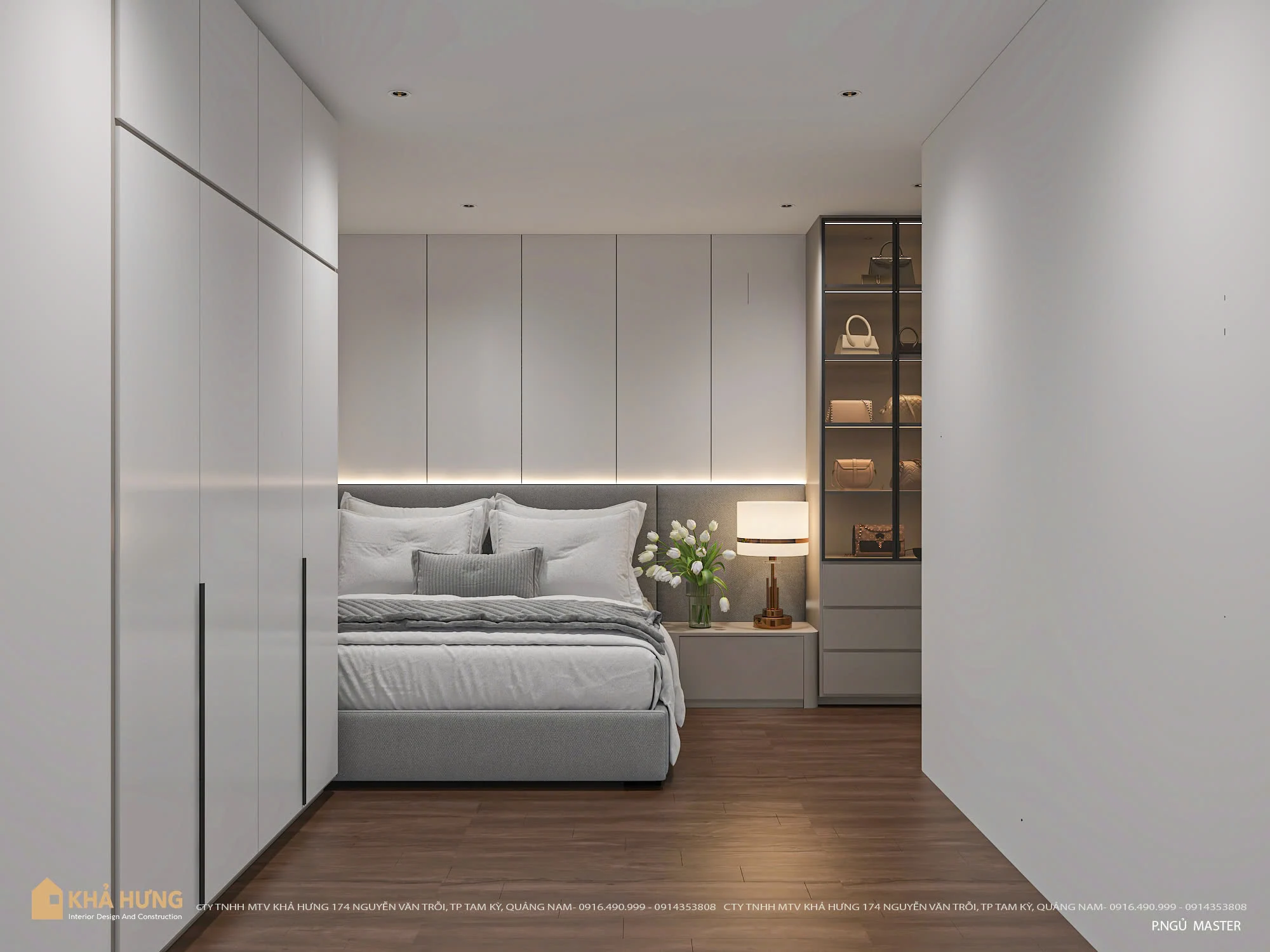 Không gian phòng ngủ được thiết kế gọn gàng, kết hợp ánh sáng dịu nhẹ mang đến sự thư thái sau một ngày dài. Một góc trưng bày tinh tế vừa tạo điểm nhấn nghệ thuật, vừa khẳng định gu sống hiện đại và sang trọng của gia chủ. Đây chính là không gian lý tưởng để tái tạo năng lượng và tận hưởng sự bình yên.