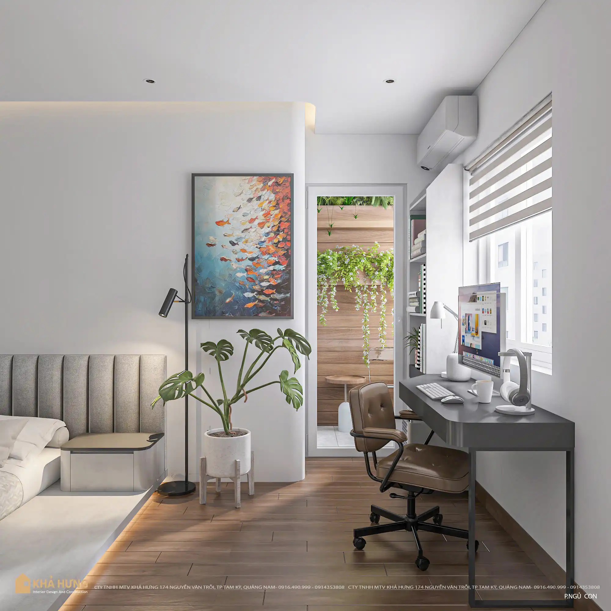 Trong thiết kế căn hộ tiện nghi, màu sắc đóng vai trò quan trọng. Sự kết hợp hài hòa giữa gam màu trung tính nhẹ nhàng cùng ánh sáng dịu, điểm xuyết bằng cây xanh, mang lại sự thư thái và cảm giác gần gũi thiên nhiên. Từng chi tiết nội thất đều được bố trí hợp lý, vừa đảm bảo công năng, vừa giữ trọn vẻ tinh tế trong thẩm mỹ.