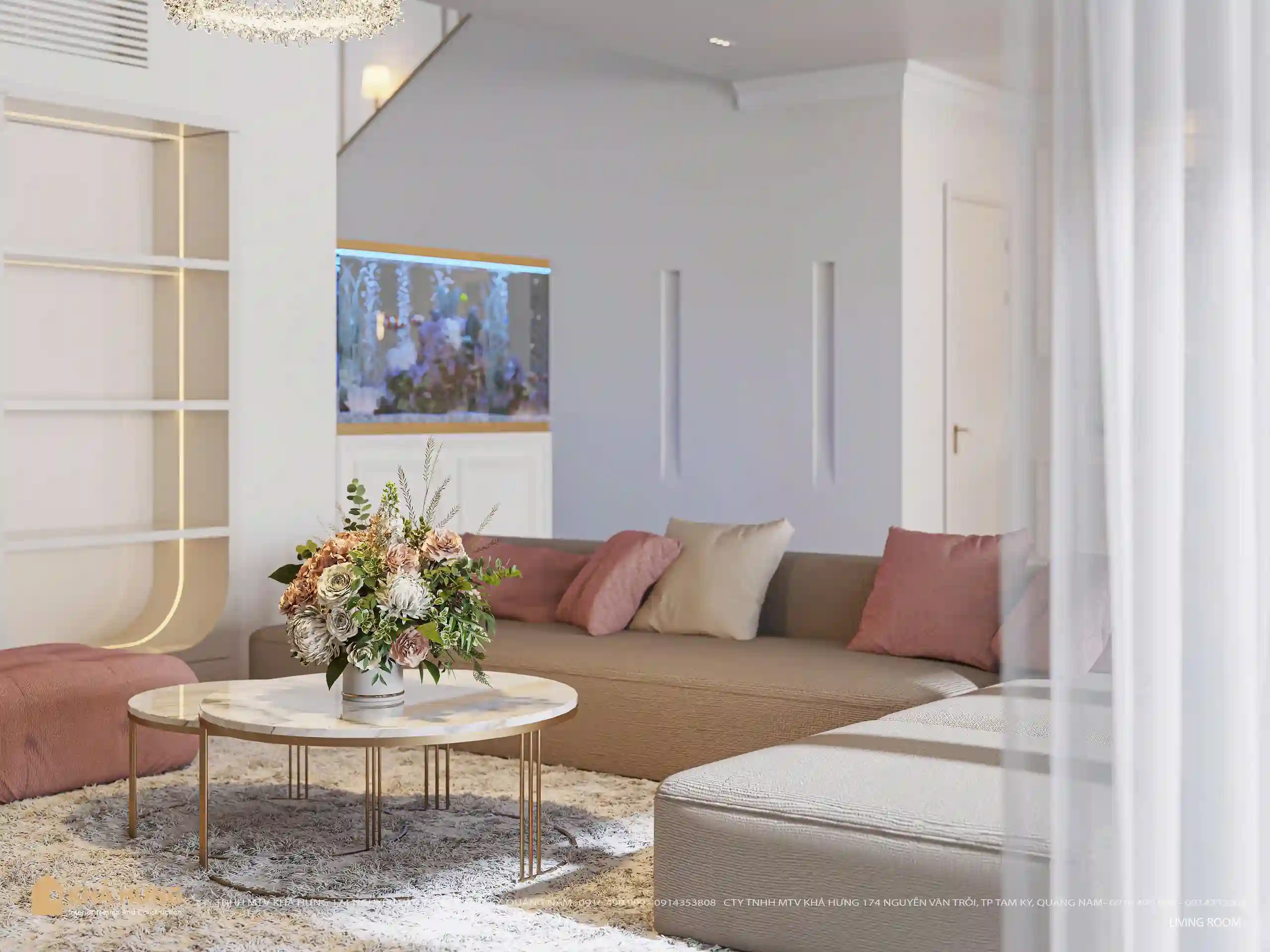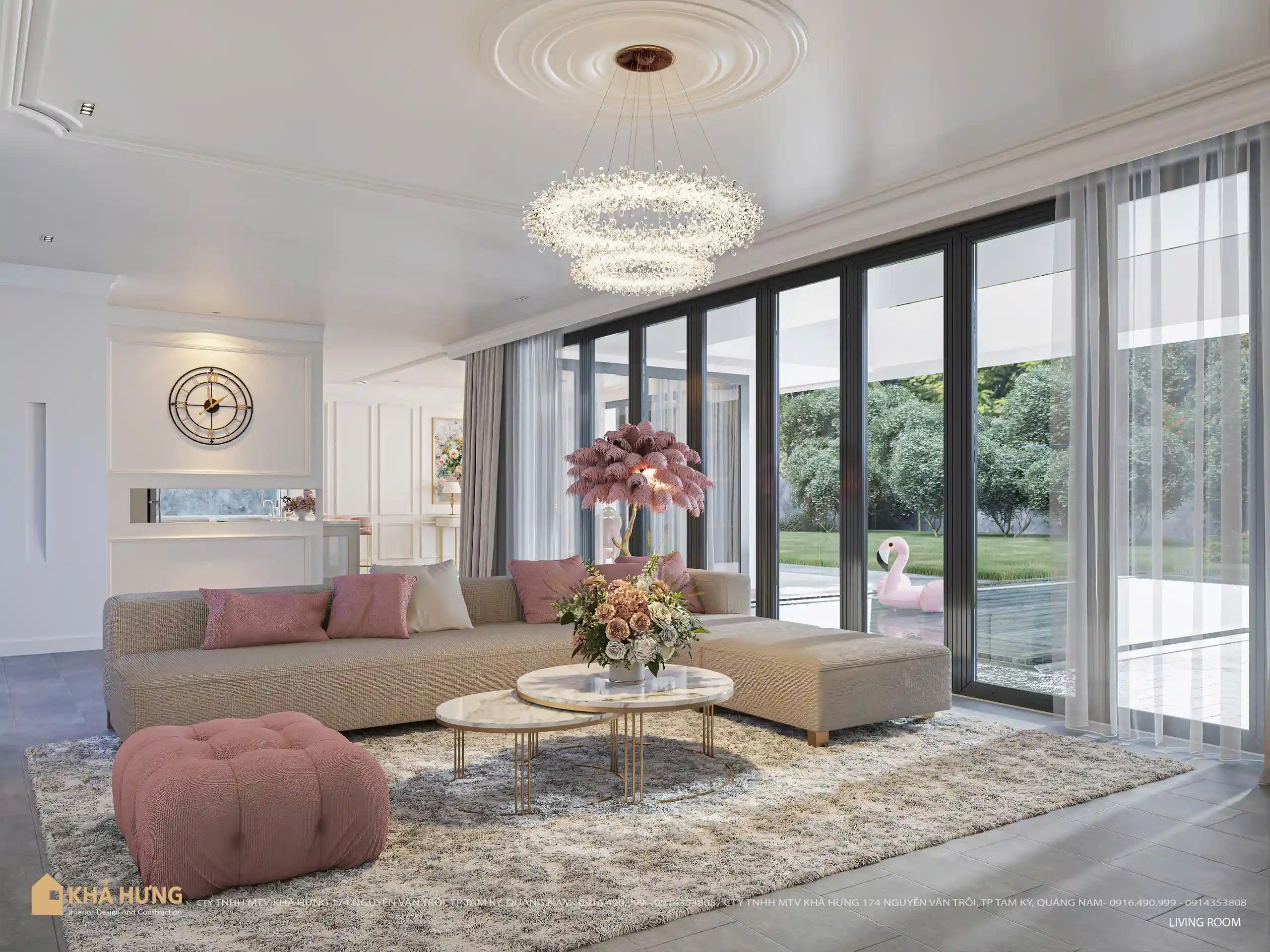 Một bộ sofa hồng nhạt, kết hợp bàn trà mặt kính và ánh sáng tự nhiên giúp không gian trở nên mềm mại, tươi mới.