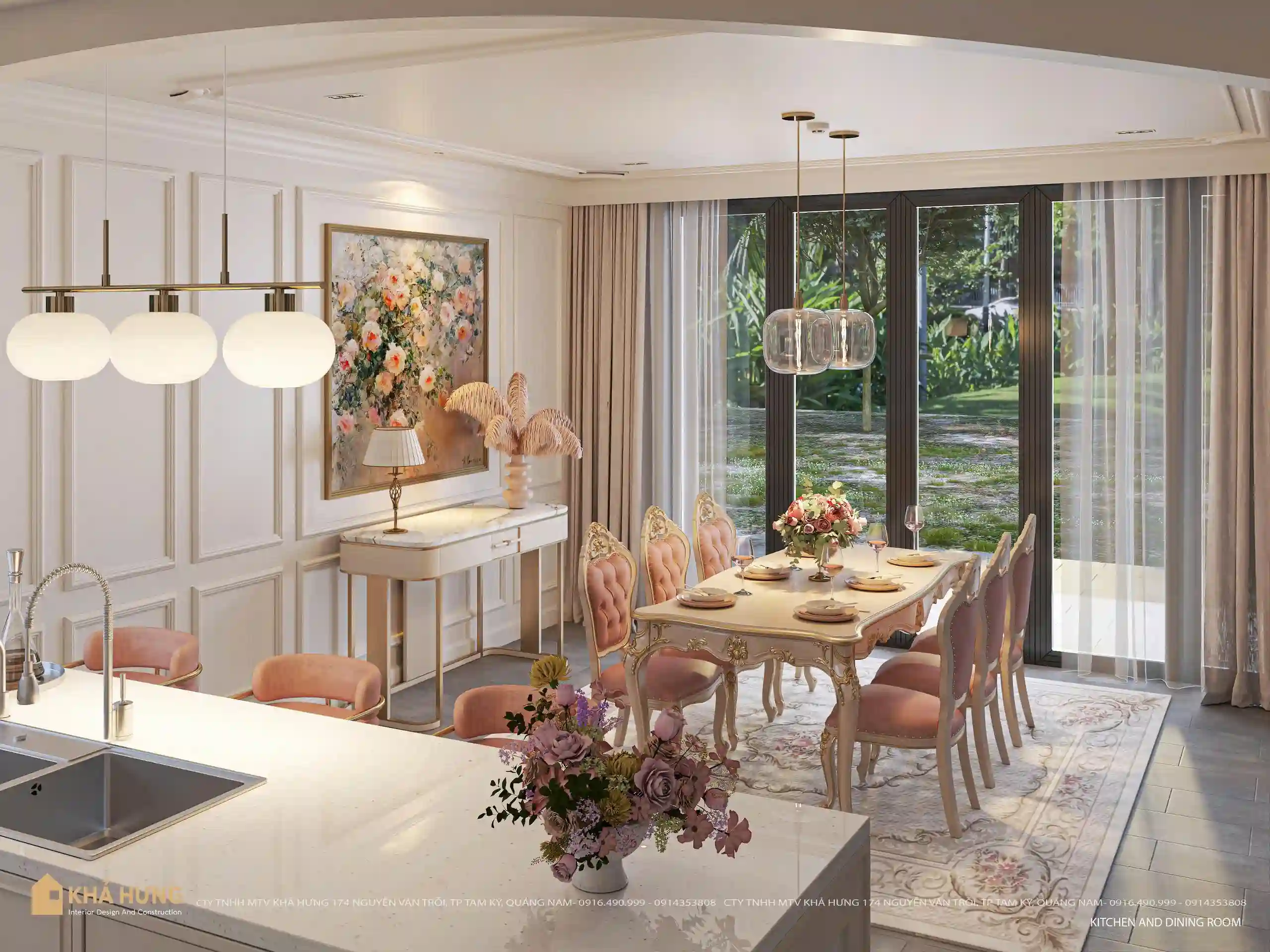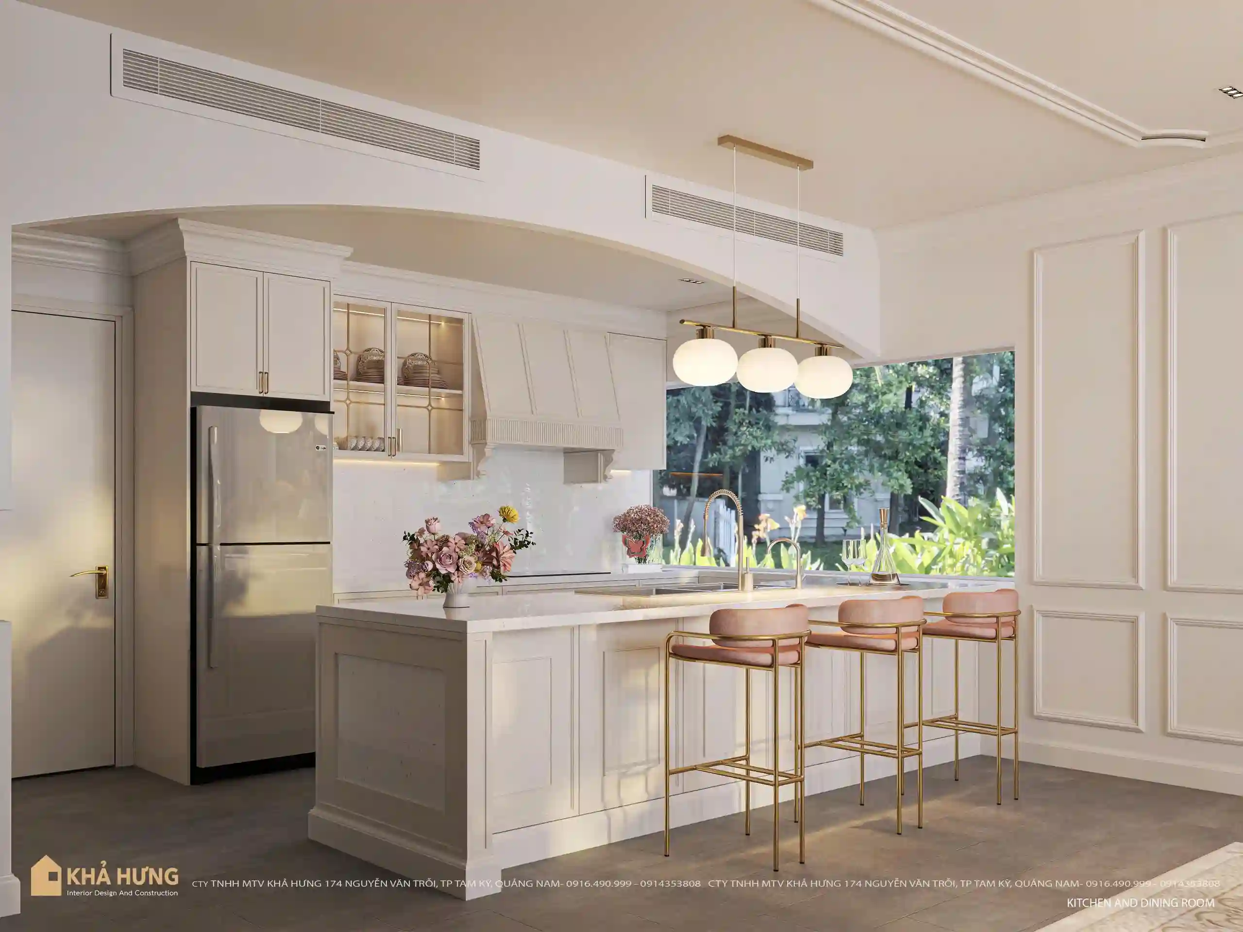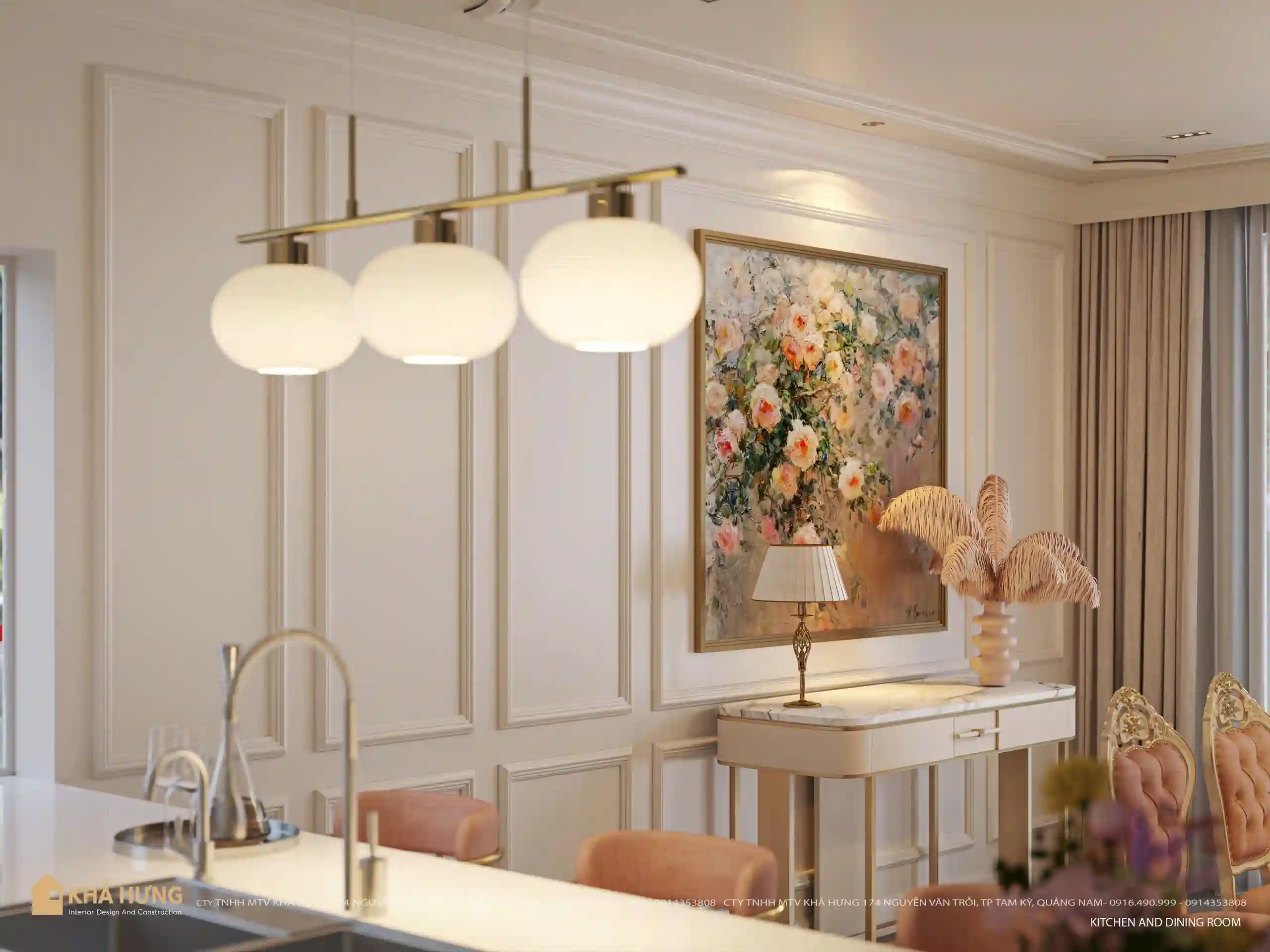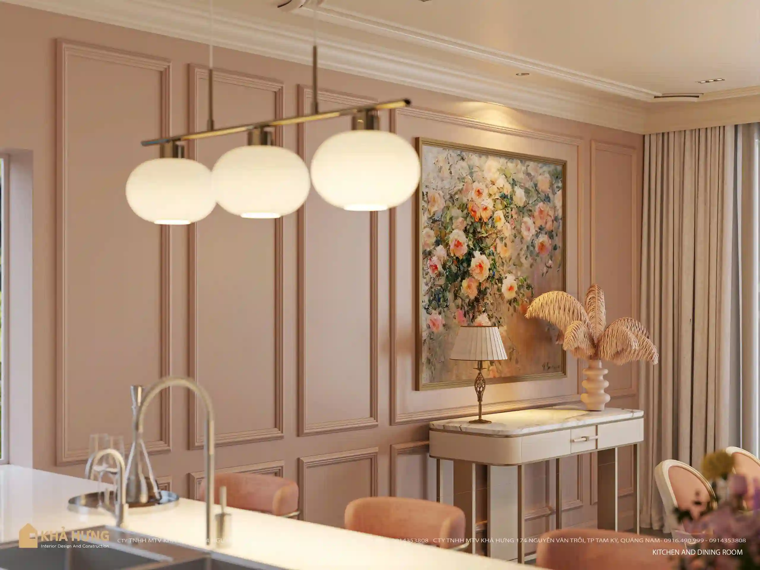 Gợi ý: sử dụng ánh sáng vàng ấm hoặc đèn chùm pha lê nhỏ giúp căn bếp thêm phần lung linh, tạo cảm hứng nấu nướng mỗi ngày.